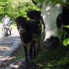 Reggel 9 után indultunk neki. Hamar elfogyott az aszfalt, már ha annak lehet nevezni egyáltalán az útburkolatot. Tibi első talajtorna gyakorlata következtében le is tört a BMW első teleszkópszárára rögzített tárolója, ez késztetett bennünket az első megállóra. Leszerel, elcsomagol. Közben egy tehéncsordával barátkoztunk, a pásztorok (nagypapa és unoka) kevésbé voltak közvetlenek, nem tudtunk velük kommunikálni. De így utólag az jut eszembe, talán csak meg voltak rökönyödve, mi a francot keresünk ott?