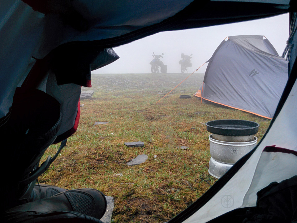 Ekkor még nem sejtettük, hogy ebből egy hosszabb kényszerpihenő lesz, ugyanis a következő 36 órából végül nagyjából 35-öt a sátrak belseje által jelentett viszonylagos melegben és szárazságban töltöttünk. Feltámadt a szél, a levegő lehűlt 5-6 fok környékére és a köd is leereszkedett, a látótávolság 5-10 méter között volt, úgyhogy nem akartuk megkockáztatni, hogy elindulunk. A rendelkezésre álló élettér ~2,5 négyzetméteres mivoltából kifolyólag ezek az órák sok izgalmat nem tartogattak, viszont az bizonyossá vált, hogy edzeni akár egy sátorban is lehet, fekvőtámaszokhoz, felülésekhez nem kell nagy hely.