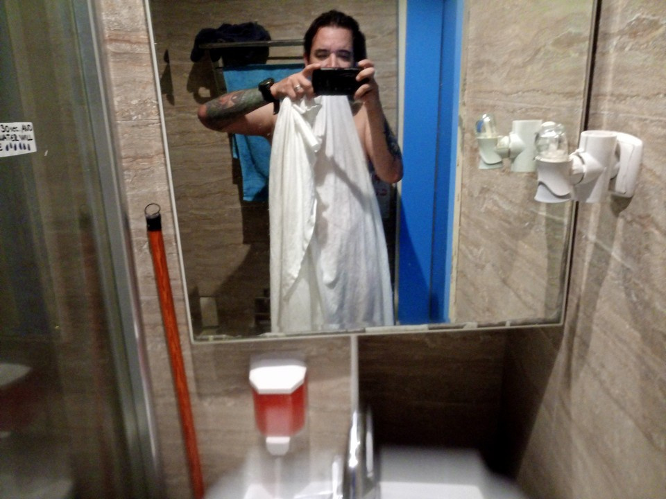 A hostel tökéletes választás egy éjszaka eltöltésére, szinte ki sem kell csomagolni, törölközőnek megteszi a lepedő is (reggel fürdesz). Mivel tényleg nem csomagoltam ki a tisztasági csomagomat, így a vizesblokkban való kézmosó szappan is megfelelt a zuhanyzáshoz. Kicsit más illatom lett, de működik a módszer. Talán a mosogatószer is beválna… Kicsit ősemberek voltunk a csatafelszerelésünkben és a csomagjainkkal, nem nagyon illettünk a társaságba. Mondjuk Máté azt mondta, hogy én amúgy is inkább ősember vagyok, nem a kontraszt teszi.