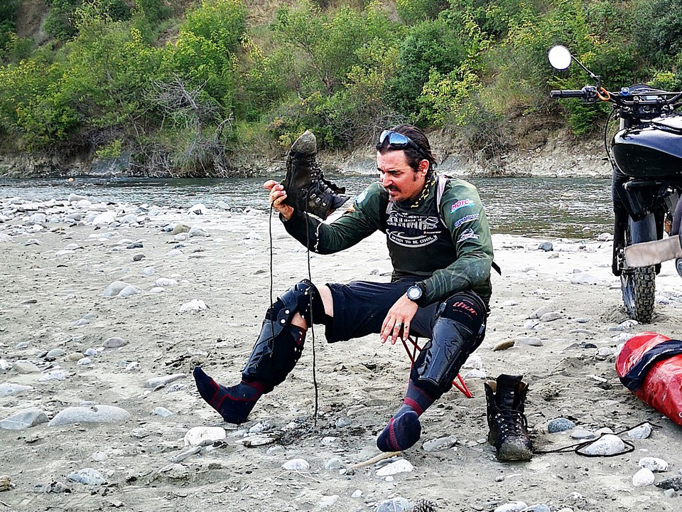 A nap parádésra sikerült, élményekkel telve táboroztunk le a mederben. Megkóstoltuk a Máté által készített szárított húst is, és megállapíthattuk, hogy jól sikerült. Finom, tápláló. Reggelre nagyjából meg is száradtak a vizes cuccaink, persze a csizmát/bakancsot kivéve. A V-strom testalkata az átkeléseknél kifejezetten előnyösnek tűnt, úgy siklott a vízen, mint egy szárnyas hajó. Esés nélkül sikerült végigcsinálni, engem egyszer levert a lábtartóról a víz, azután már óvatosabban, a motoron ülve evickéltem keresztül a folyón, ahol utunkat próbálta állni.