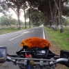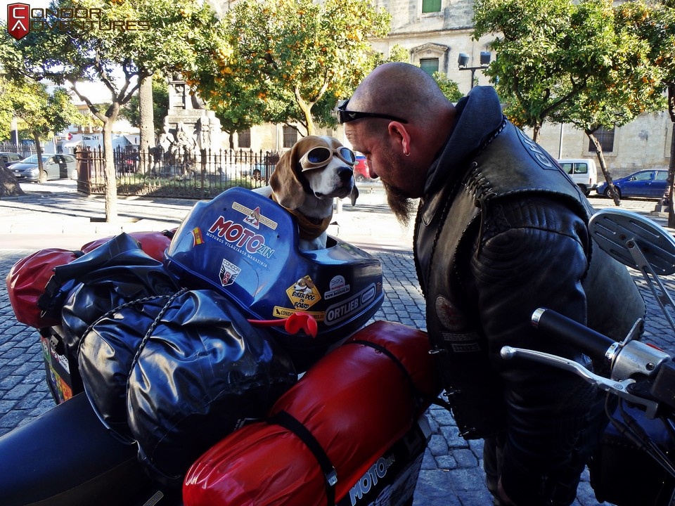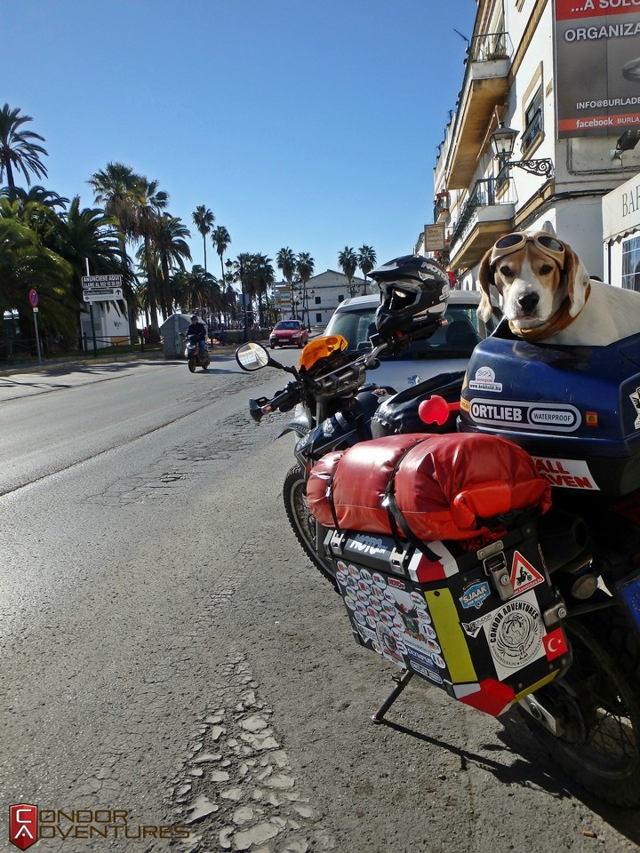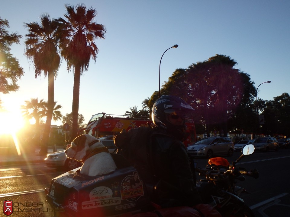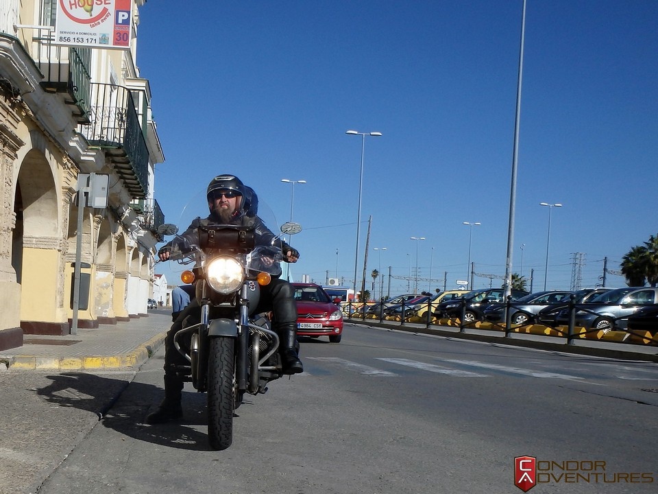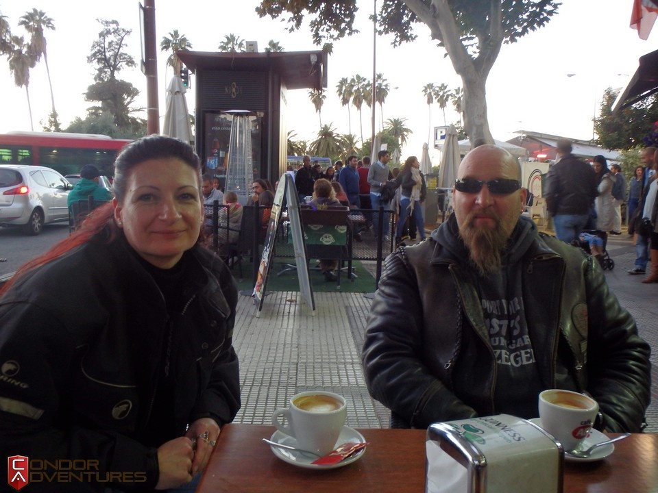 Eljött hát a találkozó napja Zoliékkal. Út közben sok helyen megálltam, hogy teljen az idő, de így is 4 órát ücsörögtünk Cadizban az út mellett Brigivel. Végre megérkeztek egy Moto Guzzival. Ők elég messziről jöttek, és még aznap haza is kellett érniük. Ezért csak egy rövid közös motorozásra volt lehetőségünk, megültük a haditanácsot és elindultunk Sevillába együtt.