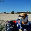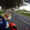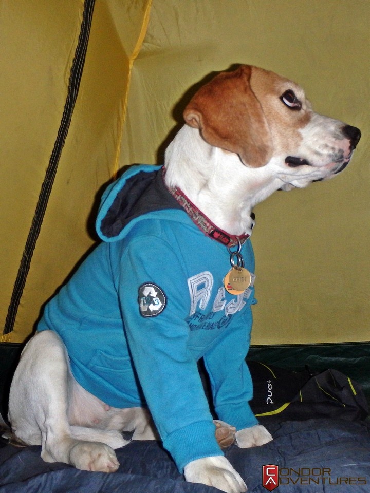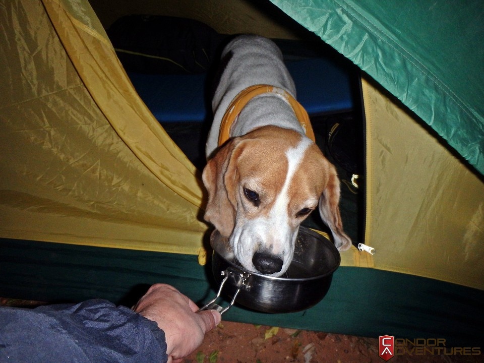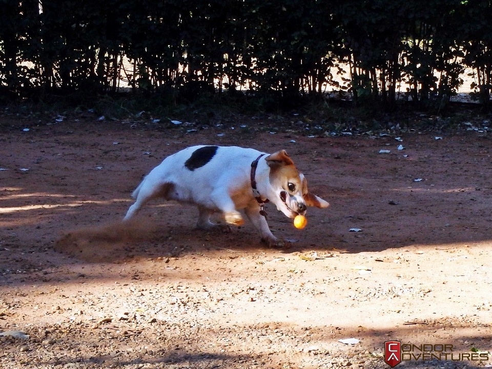 A dumaparti közben ránk is esteledett, elbúcsúztunk hát. Rájuk még 250 km várt hazáig, én arra számítottam, hogy nem túl messze találok egy szálláshelyet. A GPS ismét nem okozott csalódást, egy órán belül egy városszéli kempingben próbáltam Brigi energiáit levezetni a szokásos labdajátékkal.