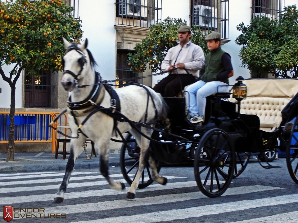 Üldögéltünk egy keveset az ezúttal turistákkal gyengébben zsúfolt központban, beszélgettünk és folytattuk az ismerkedést, hiszen erre kevés időnk volt az első találkozásunk óta. Körülöttünk lovas kocsik furikáztak a narancsfákkal szegélyezett utcákon, itt szívesen időztem volna tovább, de indulnunk kellett Sevilla felé.