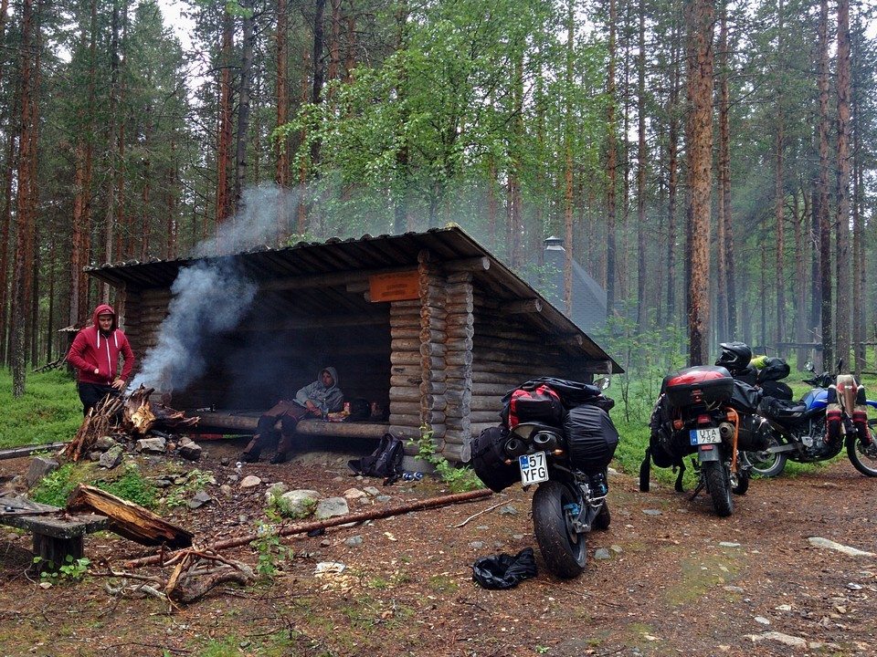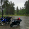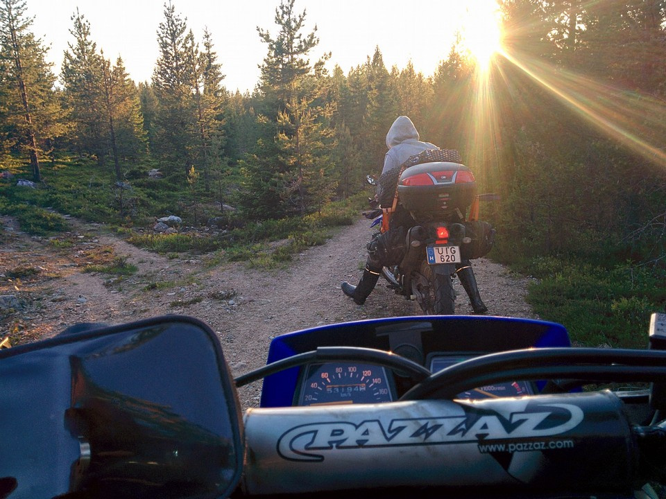 Az itteni penzum letelte után Rovaniemi felé vettük az irányt, aztán megálltunk egy gyors vizitre Napapiiriben, azaz Mikulásfalván a sarkkörnél. Tovább haladva észak felé nemsokára csapatunk egy plusz fővel bővült, Jussival, Tomi egyik finn cimborájával. Az ezt követő napon jött el időjárás tekintetében a második mélypont, 3-4 órát motoroztunk szakadó esőben és 5-6 fokban egy földúton, ami Inari felé vezetett. Az eső végére úgy néztünk ki, hogy amikor végre találtunk a semmi közepén egy kávézót, annak tulaja a kiszolgálás közben finoman érdeklődött afelől, hogy mi volna a véleményünk a kávéink kint történő elfogyasztását illetően.