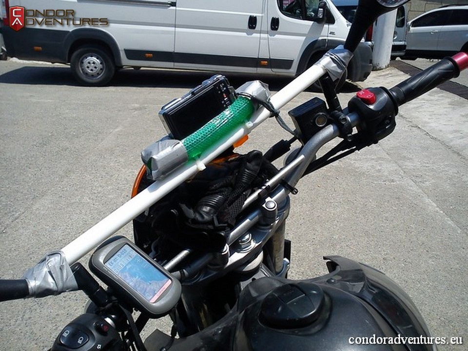 A NaviGate Kft. jóvoltából teszteltem a 450-est. Sokan mások is megtették ezt előttem, igazából a legújabb Montana típus volt halálra jelölveJ de a túrám indulásáig sajnos nem érkezett meg Magyarországra. A Montanát úgy is reklámozzák: „szívós darab”, hát ebben hiba nincs az Oregon esetében sem. Mivel számomra szükséges és használatos tudásban kb annyival bír mint a Dakota sok újdonságra nem számíthattam. Világjáró szemmel nézve a tulajdonságait abszolút negfelelő szerkezet. Motoron most már tudom mennyivel jobb ez a nagyobb kijelző, azt gondolom optimális a mérete, legalábbis nekem épp megfelel. A kormányra biciklis tartóval rögzíthető ami nem drága mint az autós szettek.
